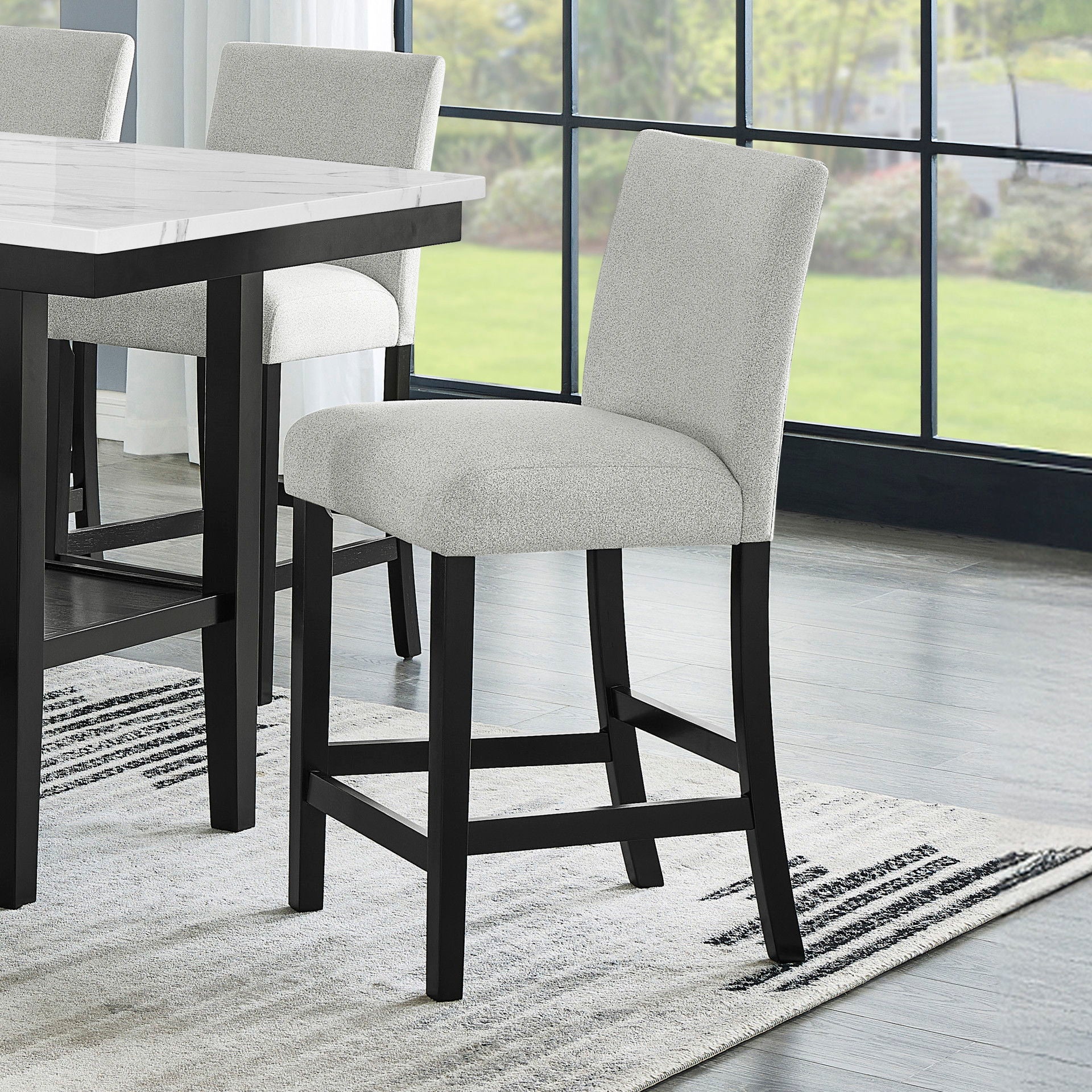 The Carissa Counter Chair in Stone blend durability with modern charm. Crafted with solid Rubberwood legs for lasting strength, each chair features fully upholstered seats and backs in soft, easy-care 100% polyester fabric. Plush memory foam cushions offer supportive comfort, making every meal feel like a treat. Finished with deep espresso legs, these chairs bring contemporary elegance and inviting style to any dining space.