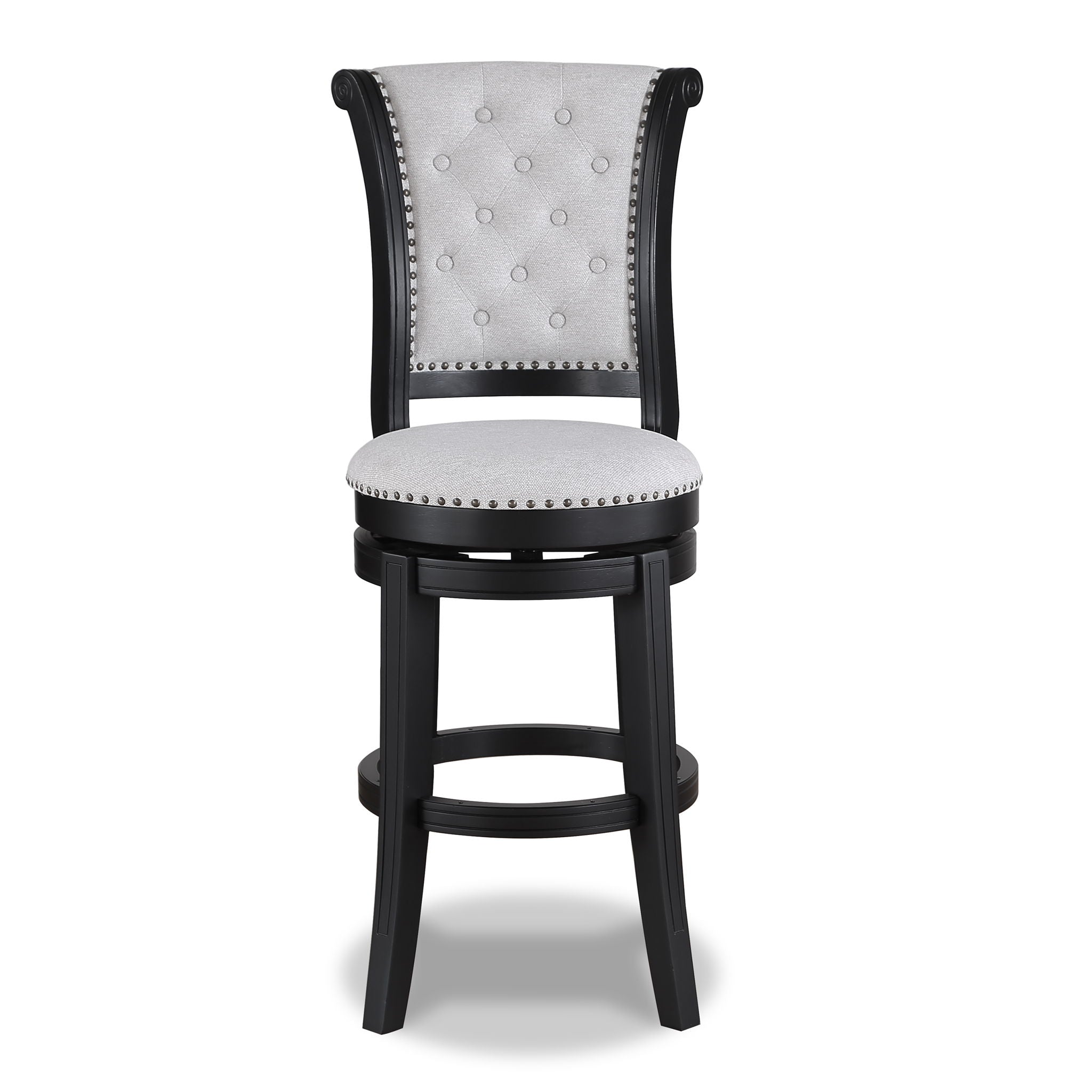 The Granville Swivel stool is beautifully crafted. With a button tufted full height back, nail head trim detail, and cushioned upholstered seat, it provides a classic look that adds a touch of sophistication to your space. Upholstered in a rich espresso vinyl, it is not only visually appealing but easy to care for. A 180 degree swivel and wood footrest offer accessibility and comfort. Full assembly required.