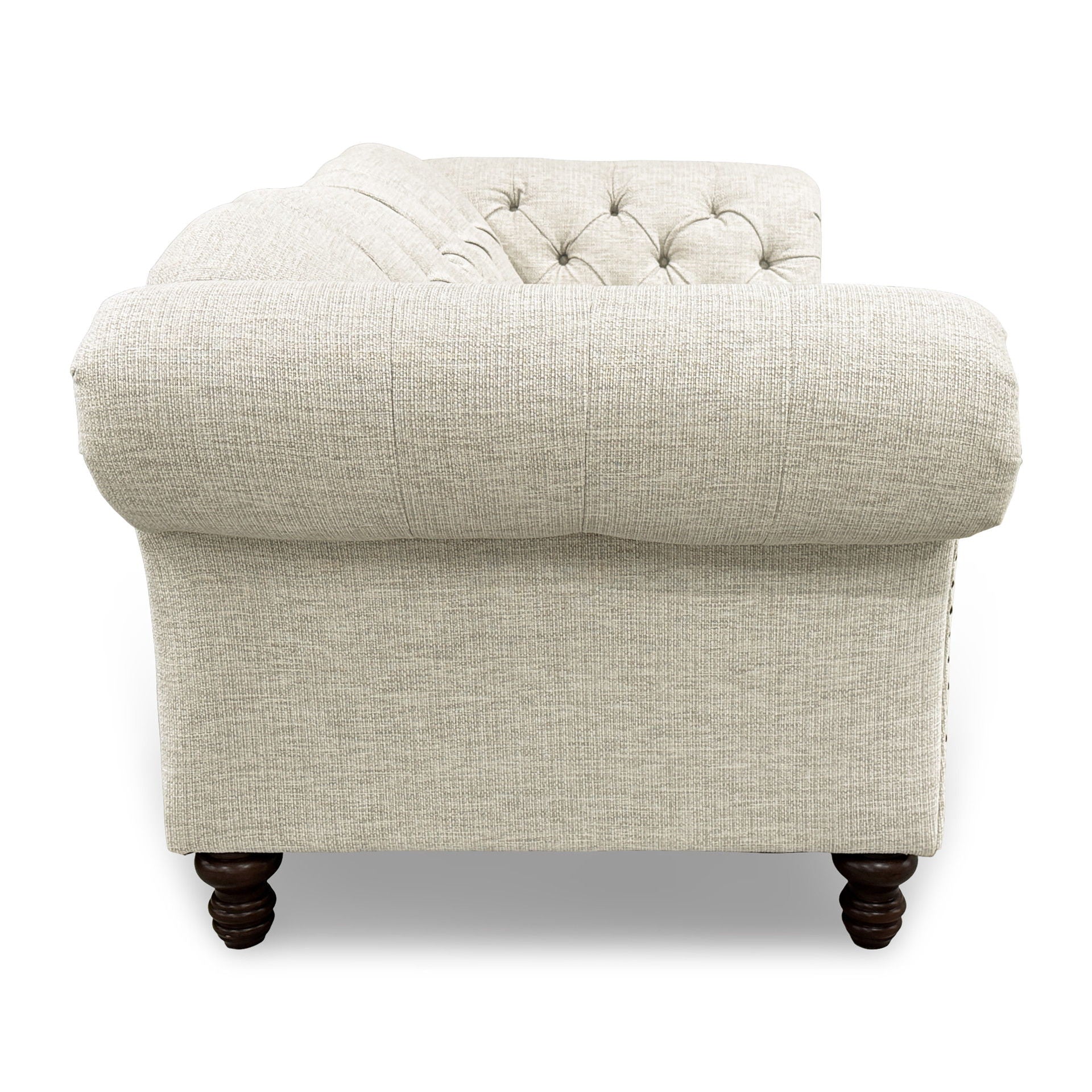 - Cozy-Easy Care Fabric: 100% Polyester natural woven upholstery is carefully tailored and complemented by gracefully shaped backs, button tufting and nailhead trim.