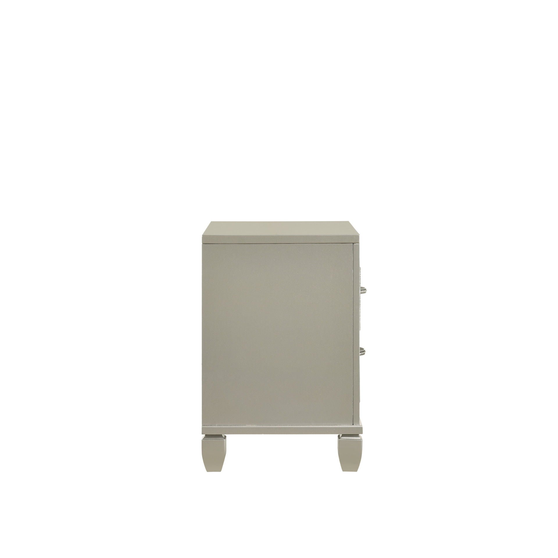 Discover the RadianceTwo Drawer Nightstand, a perfect blend of quality construction and luxurious finish. Crafted from a combination of Solid Rubberwood and manufactured woods, this nightstand offers ultimate stability and durability. The semi-gloss lacquer finish provides a silky, modern framework to this eye-catching collection. Glamorous details such as Glossy textured inlays and mylar trim frame the drawers, which showcase a crushed crystal look decorative laminate front, topped by brushed chrome finish handles with inset crystal accents. The heirloom-quality English dovetail drawers operate smoothly on full extension glides, with finished interiors providing snag-free storage. The top drawers have felt lining, offering added protection for your jewelry, watches, or glasses. Add a glamorous appeal to your bedroom with the Radiance Nightstand.