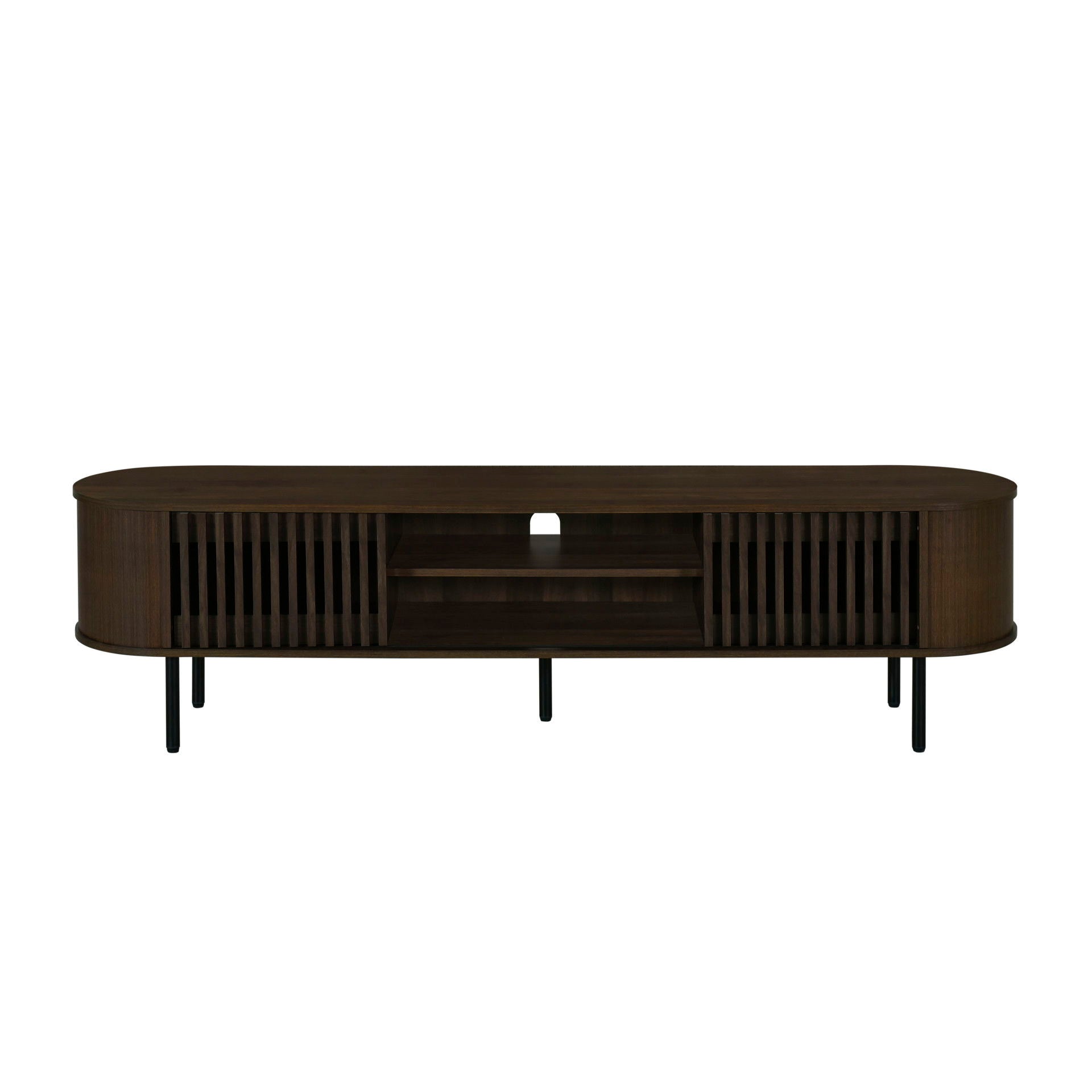 The Brax 70" TV Console with Sliding Doors combines sturdy, eco-friendly construction with ample storage and modern style. Crafted from manufactured wood and covered in durable, environmentally friendly decorative laminate, this console is not only sleek but also sustainable. With its 71" width, it offers plenty of space on top to accommodate large-screen televisions. The sliding tambor doors not only conceal components but also reveal decorative storage space, allowing for both practicality and aesthetics. Its mid-century modern appeal is enhanced by black metal legs and rounded edges, giving it a contemporary touch. The tambor-style doors further add character and distinction to the design. The natural beige finish adds warmth and versatility, complementing a variety of décors. Whether your style is modern, transitional, or eclectic, this console is sure to enhance your living space with its combination of storage and style.