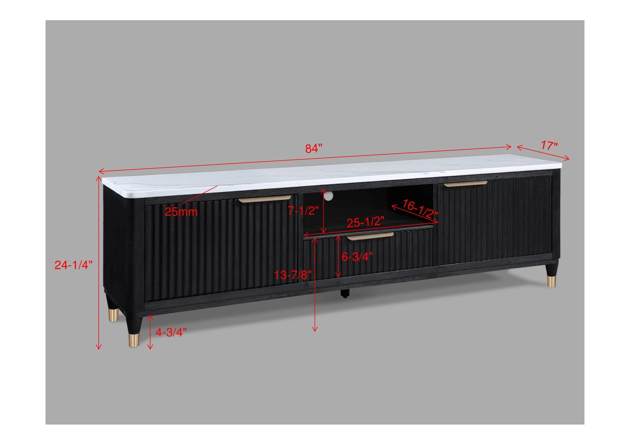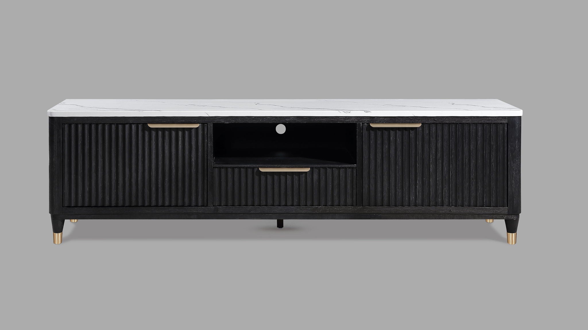 This entertainment console brings modern luxury and sleek sophistication to any living space. Featuring a striking contrast, fluted wood facade with a pristine faux marble top, this piece embodies refined elegance. Brass-tone accents and tapered legs add a touch of mid-century flair, enhancing its chic, upscale appeal. With generous storage space behind its textured doors and an open center shelf for easy access to media components, this console is as functional as it is stylish. Ideal for contemporary interiors, it’s the perfect blend of high-end design and everyday practicality, making it a standout addition to your home decor.